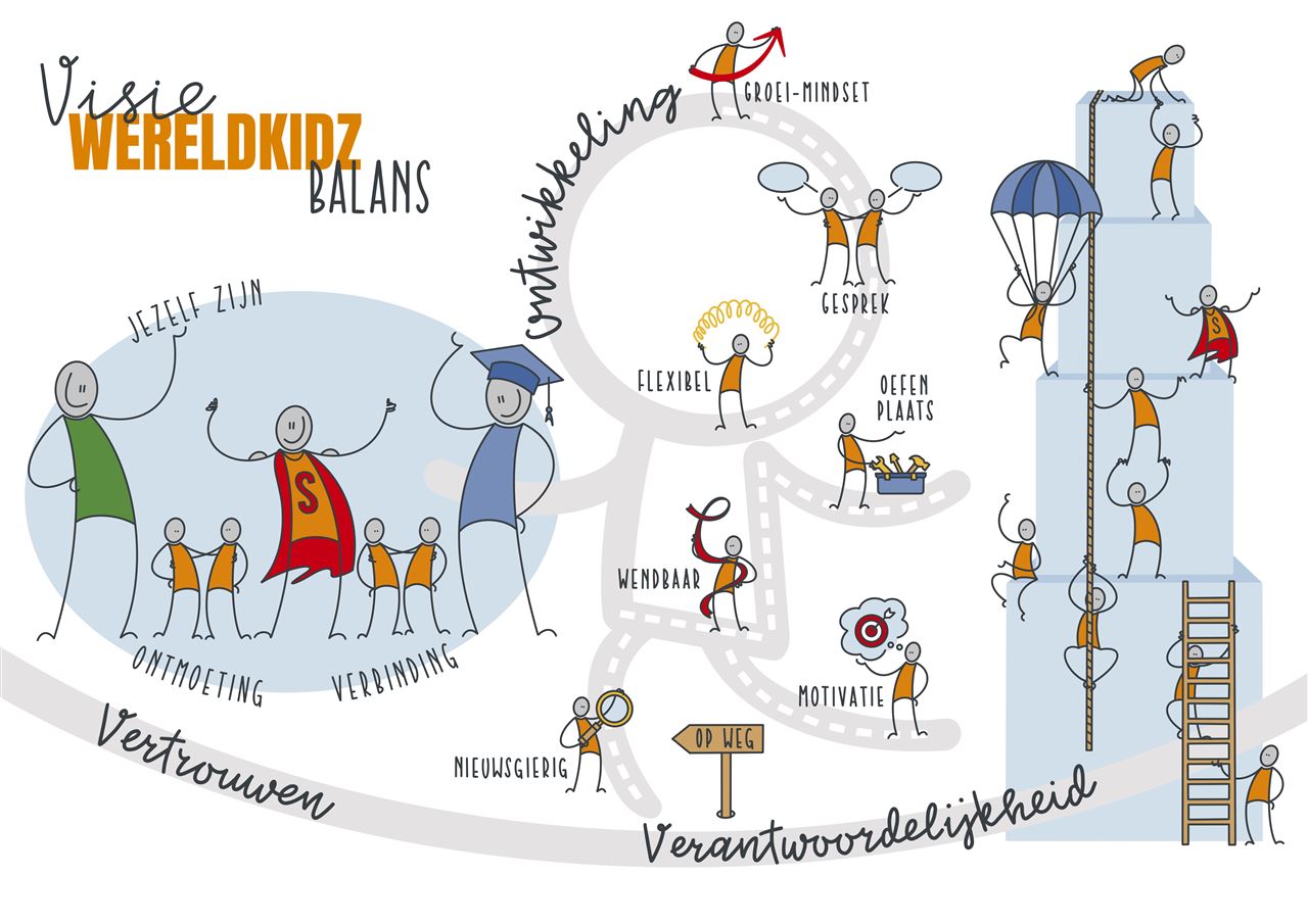 WereldKidz Balans zet in op goed onderwijs door een omgeving te creëren waarin vertrouwen is, ontwikkeling centraal staat en groeiende verantwoordelijkheid wordt aangemoedigd. We zoeken naar de balans tussen hoofd, hart en handen in ons onderwijs. We doen dit samen in de pedagogische cirkel: leerling, opvoeders en school.